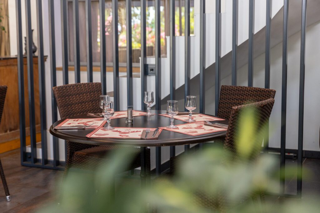 This modern, functional yet warm restaurant welcomes you from May to September, inside or outside on the terrace with pink oleanders.